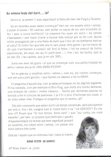 Però bé, deixem les tristeses en un racó, que avui comencem uns dies de festa i convivència i el que hem de fer és gaudir al màxim dels actes programats i aprofitar aquests dies per incrementar les nostres relacions per tal que ens coneguem més i millor.
