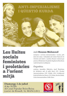 El diumenge 2 de juliol a 2/4 de 7 del vespre tindrà lloc al Casal Popular Boira Baixa de Manlleu, una xerrada sobre les lluites socials feministes i proletàries a l’orient mitjà (anti-imperialisme i qüestió kurda), a càrrec de Houzan Mahmoud, escriptora i activista internacionalista i secular, pels drets de la dona, Confundadora de Cuture Project for Art Feminism and Gender a Londres (Projecte Cultural que promou el feminisme i la qüestió de gènere al Kurdistan i amb els kurds en la diàspora).