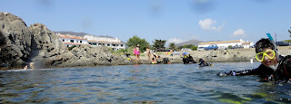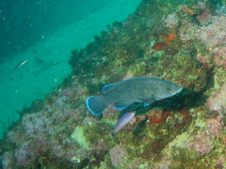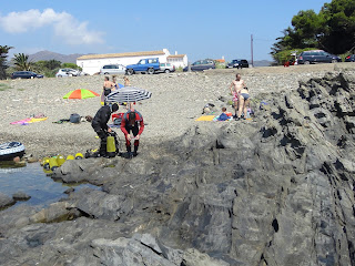 Ens llencem a l’aigua i, abans de submergir-nos, ens acostem a les roques nedant en superfície. Se’ns fa una mica llarg aquest trajecte.