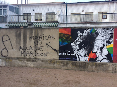 | Imatge del mural atacat amb la pintada homòfoba al costat |