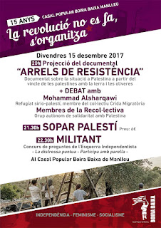 Aquest divendres 15 de desembre a les 8 del vespre tindrà lloc al Casal Popular Boira Baixa, la projecció del documental «Arrels de Resistència», una producció del grup de solidaritat amb Palestina La Recol·lectiva. Tot seguit, hi haurà debat amb l’activista sirio-palestí i membre del col·lectiu Crida Migratòria Mohammad Alsharqawi i membres de La Recol·lectiva, entre els quals es troba un manlleuenc. Alsharqaw ens explicarà de primera mà l’actual situació a Palestina després que el govern dels Estats Units hagi decidit traslladar la seva ambaixada a Jerusalem, reconeixent-la així com a capital d’Israel i eliminant la solució dels dos estats.