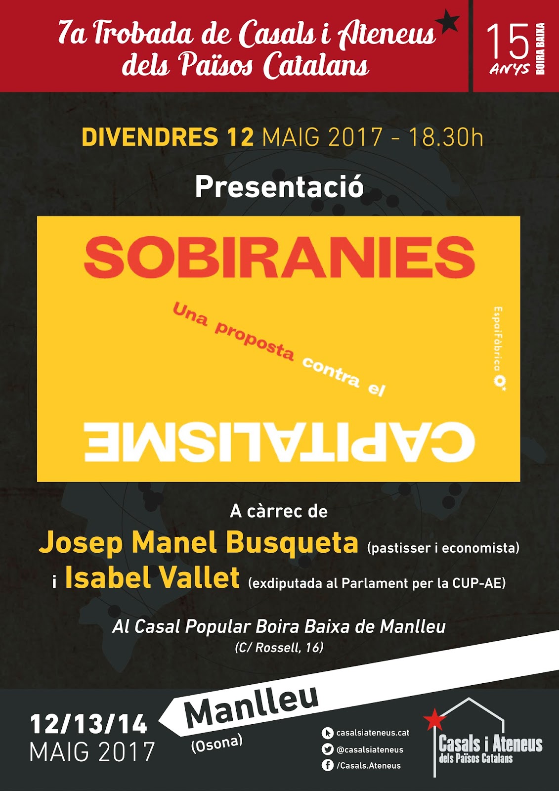 [NOVETAT] Des de la 7a trobada de Casals i Ateneus dels Països Catalans s’organitza la presentació del projecte Sobiranies. L’acte tindrà lloc el divendres, 12 de maig, a 2/4 de 7 del vespre al Casal Popular Boira Baixa de Manlleu, i anirà a càrrec de Josep Manel Busqueta (pastisser i economista) i Isabel Vallet (exdiputada al Parlament per la CUP-AE), i com la resta d’activitats de la Trobada, és oberta a tota la població.
