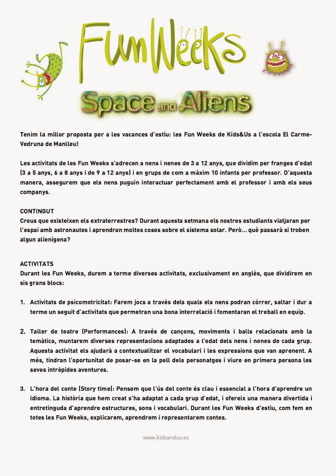La proposta de casal de Kids& us ens portarà a un estiu d’anglès ple d’alienígenes de l’espai! Amb el mètode d’ensenyament proposat per Kids & Us segur que serà del tot profitós i divertit.