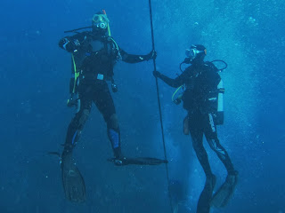 A part de la immersió, avui hem tingut l’oportunitat de viure una altra experiència: Al port de Llafranc hi havia un equip de DAN (Divers Alert Network), una organització internacional, sense afany de lucre, centrada en la medicina i la investigació i dedicada a la seguretat i la salut dels submarinistes. Ens han demanat si algú de nosaltres volia col·laborar en una prova per aconseguir dades per als seus estudis. La prova consistia en portar un ordinador de busseig durant la immersió (que facilitava DAN), respondre uns qüestionaris abans i després de ficar-se a l’aigua, i sotmetre’s a una ecografia del cor i una prova per comprovar les “bombolles” de nitrogen a la sang, mitja hora després d’haver acabat la immersió. En Pere i la Bet s’han ofert de voluntaris. Aquest és l’ordinador que li han deixat a en Pere (…que l’ha hagut de tornar, és clar):
