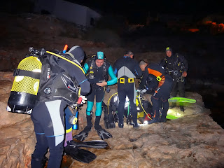 La primera nocturna del nou curs va ser el dia 21 de setembre. Aquesta vegada, vàrem començar a preparar-nos per la immersió que ja era ben fosc. Necessitàvem la llum de la llanterna per preparar l’equip.